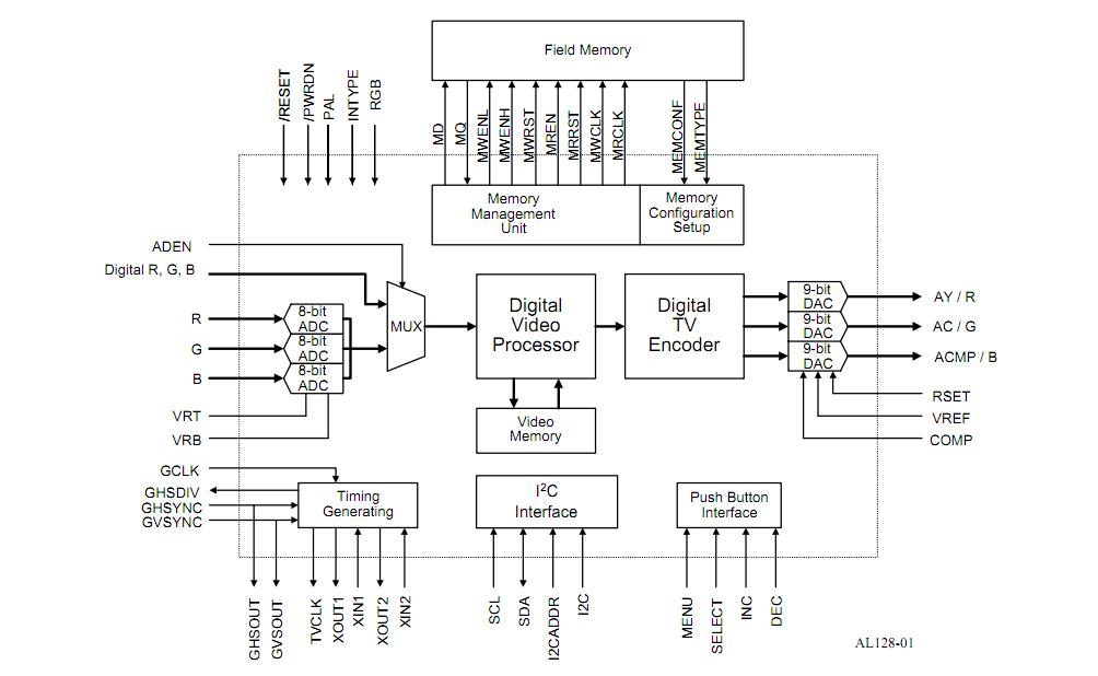 AL128B-PBF features: (1)Convert non-interlaced VGA or Macintosh video into interlaced TV format (NTSC/PAL); (2)Analog RGB output for SCART interface; (3)Highly integrated design with built-in NTSC/PAL encoder, ADC, DAC and SRAM; (4)High clarity 5-line anti-flicker filter; (5)8 levels of sharpness control; (6)Supports up to full 1024x768 VGA resolution; (7)Automatically supports scan rate from 50Hz up to 100Hz ; (8)Linear vertical and horizontal over/underscan control ; (9)Zoom and freeze controls; (10)Four-touch-button interface with on-screen-menu on TV; (11) Horizontal and vertical position/panning control; (12)Optional digital 24-bit RGB/VAFC interface; (13)Power down feature controlled by software or hardware; (14)Full programmability via I2C interface; (15)Brightness control; (16)Built-in color bar; (17)Thin, small LQFP package for PCMCIA or notebooks; (18)28×28 PQFP package available upon request.