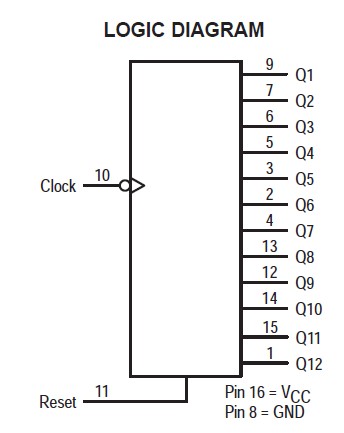 The MC74HC4040N is a 12-stage binary ripple counter. It is identical in pinout to the standard CMOS MC14040. The MC74HC4040N inputs are compatible with standard CMOS outputs; with pullup resistors, it is compatible with LSTTL outputs. The MC74HC4040N consists of 12 master–slave flip–flops. The output of each flip–flop feeds the next and the frequency at each output is half of that of the preceding one. The state counter advances on the negative–going edge of the Clock input. Reset is asynchronous and active–high.