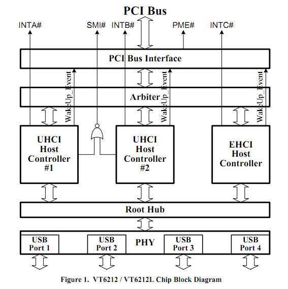 The VT6212L is an USB 2.0 UHCI and EHCI Host Controller for the PCI 2.2 Bus provides higher bandwidth (480 Mbps) and is backward compatible with USB 1.1. It implements Universal Serial Bus Specification Revision 2.0 and is compliant with UHCI 1.1 and EHCI 1.0 with a 32-bit PCI host bus interface. The VT6212L adopts 4 DMA engines with pipelined control for USB data transfer bandwidth improvement and dynamic clock stop control for power consumption reduction.